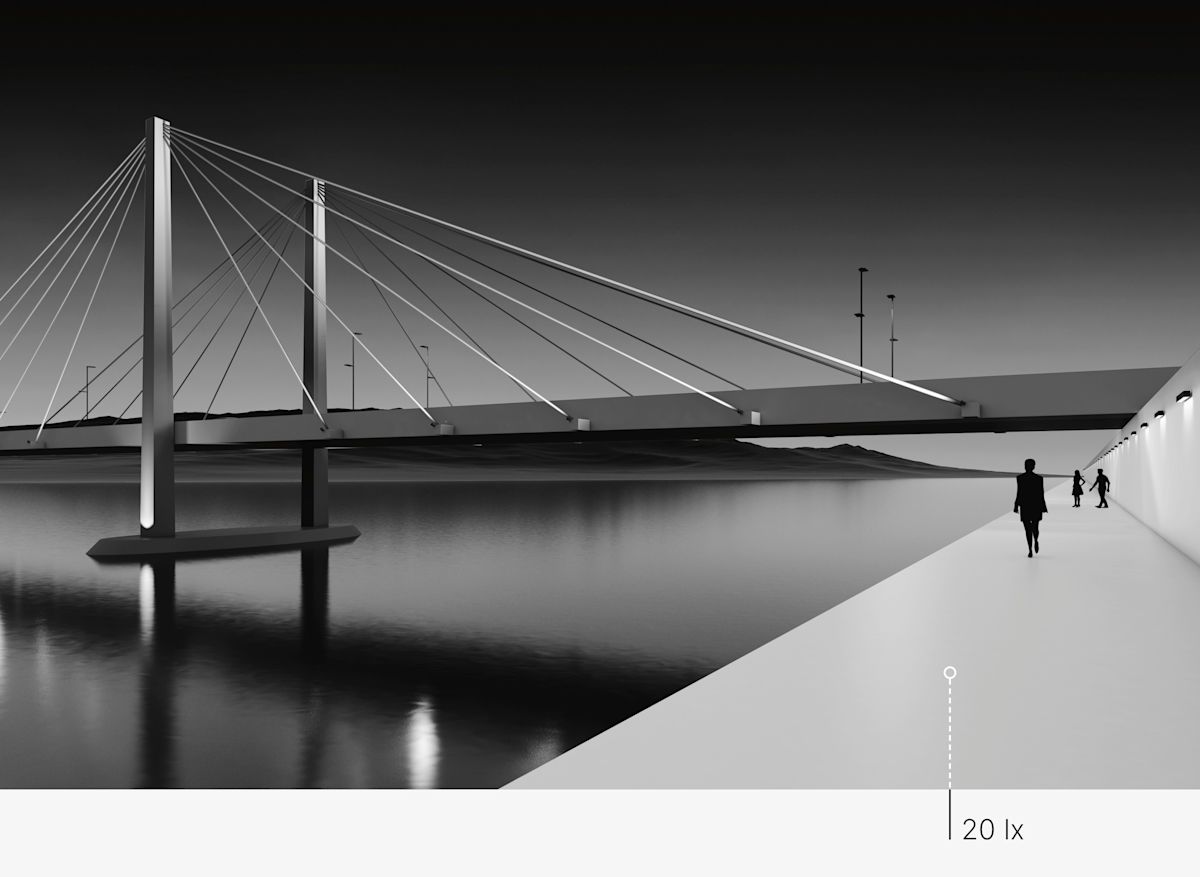A main road crosses the bridge, with cycle paths on both sides. For the road, the standard DIN EN 13 201 applies for the uniformity of light and the illumination density. These requirements are met with pole-top luminaires. The mounting height for illuminating the carriageway is 6 m. For the cycle path, the degree of illuminance must be at least 1–5 lx. Pole-top luminaires with flat beam light distribution provide the required light from the same poles from a height of 4 m. The luminaire spacing is 28 m. The light of both types of luminaires is directed onto the road surfaces as a flat beam.