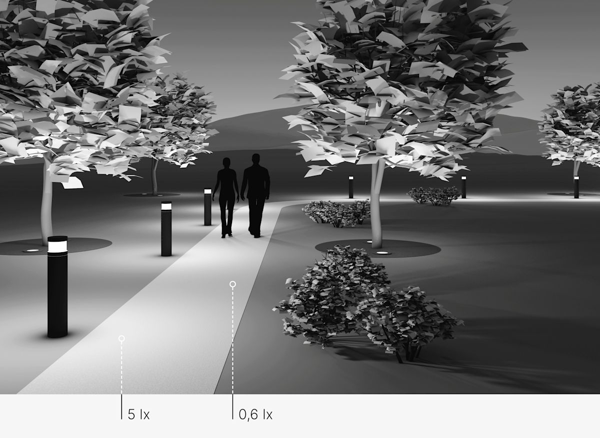 Spaziergang durch einen Park: Pollerleuchten, deren freistrahlendes Licht den Weg gleichmäßig illuminiert, flankieren den Fußgängerweg. Hierfür wird eine Anordnung der Leuchten am Wegesrand mit einem Abstand von 5,5 m zueinander gewählt. Die Beleuchtung der Sträucher und Bäume erfolgt aus dem Boden heraus. Für ein homogenes Bild werden große Bäume jeweils mit zwei Bodeneinbauleuchten inszeniert. Die Farbtemperatur des Lichts beträgt 3000 K.