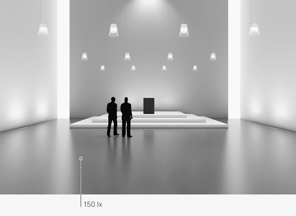 Der Beispielraum misst 15 x 17 m mit einer Raumhöhe von 11 m. Die Lichtpunkthöhe der Pendelleuchte liegt bei etwa 3,60 m vom Boden aus. Zwölf Pendelleuchten, vier Tiefstrahler und 15 Bodeneinbauleuchten wurden eingesetzt.