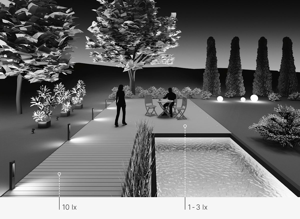 Licht gibt einem Garten Struktur und inszeniert die Bepflanzung. Abgeblendete Pollerleuchten begrenzen die Terrasse, welche am Schwimmteich entlangführt und in einen Sitzbereich mündet. Unterwasserscheinwerfer sorgen für eine mediterrane Lichtatmosphäre. Die großen Bäume im Hintergrund reflektieren das Licht der Bodeneinbauscheinwerfer. Ortsveränderliche Kompaktscheinwerfer betonen einzelne Pflanzen. Die Begrenzung des Grundstücks wird mit Kugelleuchten definiert. Über eine Lichtsteuerung kann die Beleuchtungsintensität den persönlichen Vorlieben angepasst werden.