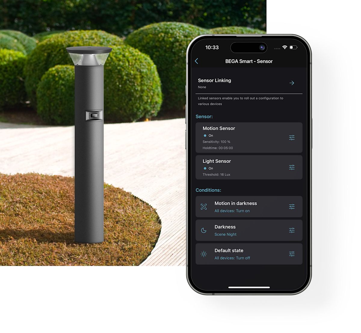 BEGA Smart ermöglicht smarte Lichtsteuerung für Haus und Garten. Leuchten mit PIR-Sensor schalten sich bei Dämmerung und Bewegung automatisch ein und steuern weitere vernetzte Leuchten. Alternativ stehen auch smarte Leuchten ohne Bewegungsmelder zur Verfügung, die per App, Zeitsteuerung oder manuell gesteuert werden können. So gestalten Sie Ihre Lichtumgebung flexibel, energieeffizient und ganz nach Ihren Wünschen – einfach und intuitiv mit der kostenlosen App BEGA Smart.