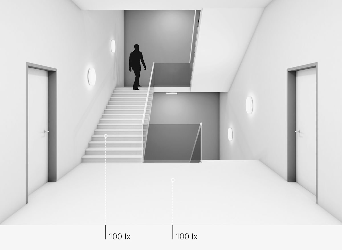 Soft light is required in the staircase so that the steps do not cast any hard, irritating shadows. The light should also be glare-free. A combination of ceiling and wall luminaires is most suitable. In our example, landings on the individual floors are illuminated with light from the ceiling. The stairs themselves, on the other hand, are accompanied by wall luminaires. Here the luminaires should have as low installation depths as possible to ensure they are not in the way on the stairs.