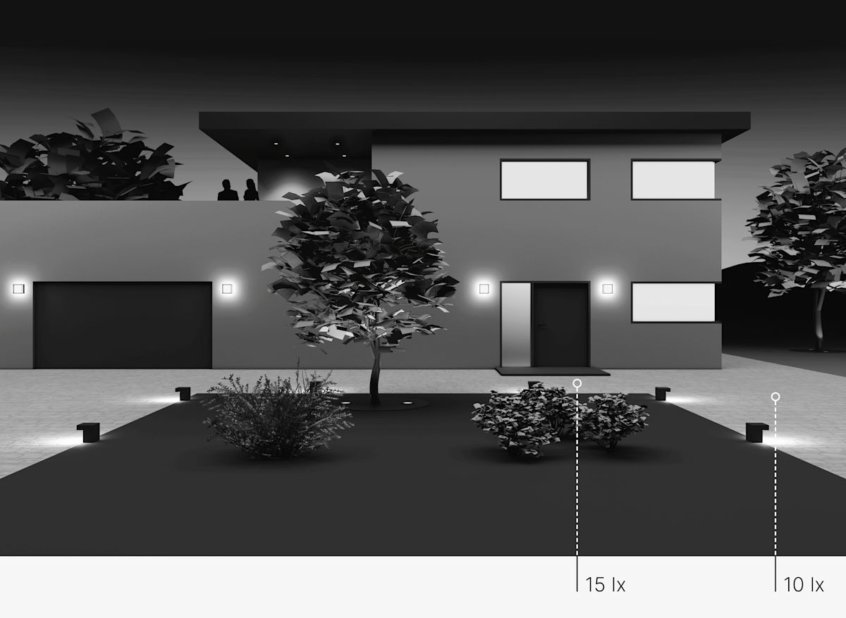 With good exterior lighting, a private house appears comfortable and inviting. At the same time, this also improves safety. The area in front of the house is structured, from the driveway to the garage, from a front garden and a path to the house entrance. Small bollards line the garden and illuminate the paths with asymmetrical wide beam light. The garage entrance has these luminaires on both sides in order to guarantee uniform light distribution. At the house, unshielded wall luminaires are installed beside the front door and the garage. This guarantees high visual comfort. The tree is illuminated with two in-ground floodlights. A motion sensor with twilight switch is recommended here to control the lighting system.