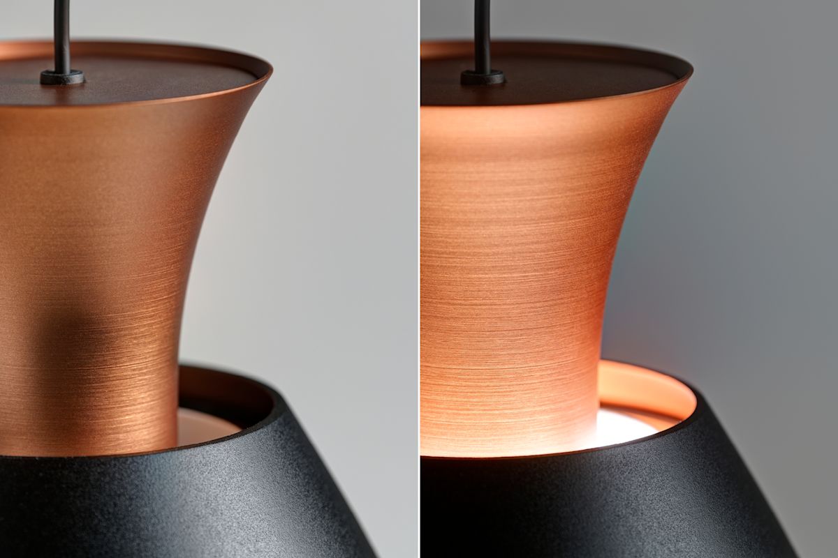 The metallic luminaire housing shields the light directed downwards, while some of the light shines upwards, emphasising the shape of the luminaire. This play of light and shadow emphasises the fine cut of the interior shades and underlines the fascinating contrast of the surfaces.