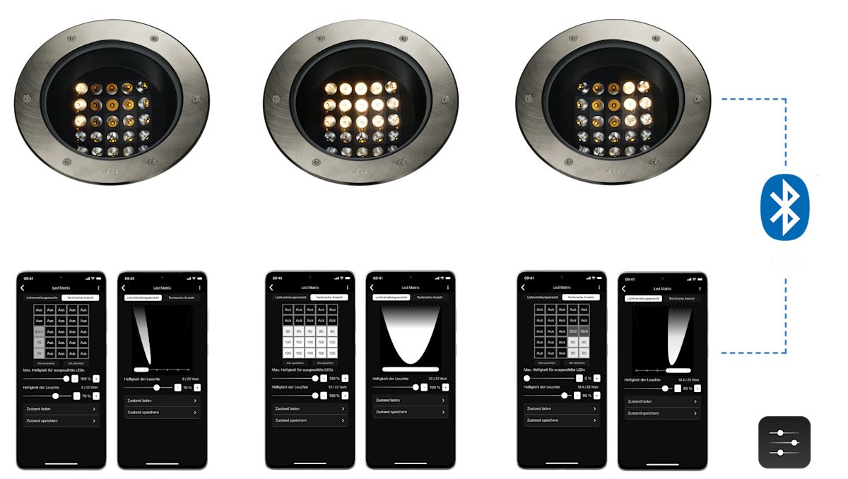 Innovatiivinen optinen järjestelmä laajentaa maahan upotettavia valaisimiamme, sillä nyt niissä on ratkaisu, joka mahdollistaa yksilölliset valaistusvaatimukset. Valonheittimissä on matriisi, jossa on 25 yksittäin ohjattavaa lediä. Ne on järjestetty 5x5-rasteriin. Tämä mahdollistaa valonjaon ja valaistustapojen tarkat asetukset – sekä symmetrinen että epäsymmetrinen valonjako ja kapea tai leveä valokeila ovat mahdollisia.