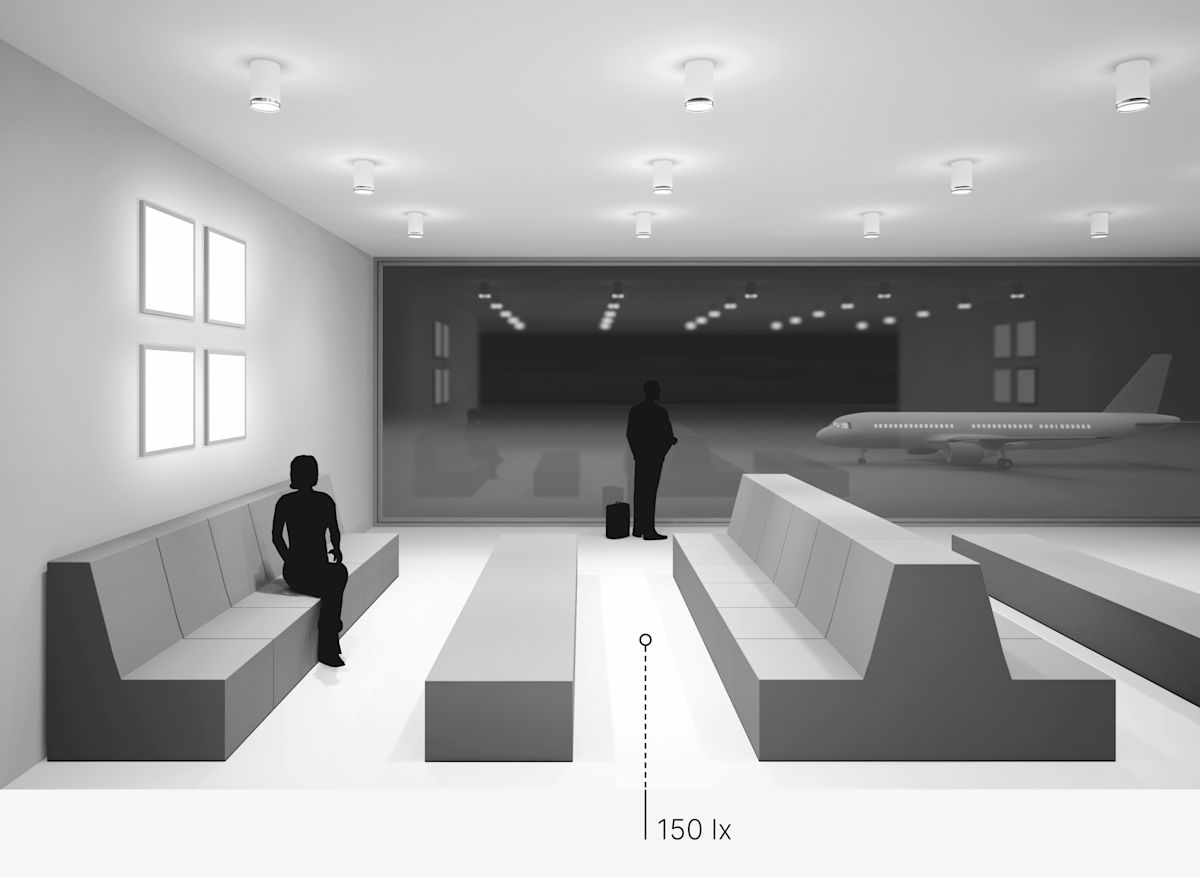 As a rule, there is a quiet atmosphere in waiting zones. Some people are reading or sleeping, others are busy with their laptop or smartphone. The illumination of the entire area is effected using downlights. Due to their thick, partially frosted crystal glass, most of the light is emitted directly downwards onto the floor. An average of 150 lx is reached at floor level. The remaining light is refracted by the edge of the glass and is diffused through the matt finish. In this way, the light is also distributed vertically into the room. In addition, flat, square wall luminaires emit soft light.