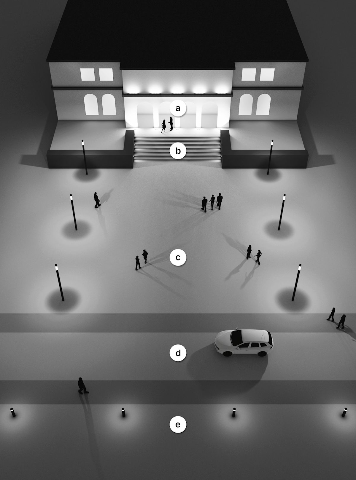 Plusieurs répartitions de luminance possibles sont illustrées à l’aide des exemples présentés. Depuis les zones les plus sombres jusqu’aux plus claires, les contrastes peuvent parfois être extrêmement forts. En conséquence, l’éclairage est ressenti comme agréable. Pourquoi ? Dans l’établissement historique recevant du public (exemple 1), l’entrée représente le point le plus éclairé. La luminance y augmente progressivement pour le visiteur. L’ensemble de la situation peut être saisi d’un seul regard. Ces facteurs confèrent un sentiment de sécurité. Les données spatiales sont à taille humaine et clairement structurées par l’éclairage. L’augmentation des luminances balise le chemin vers la manifestation. Les visiteurs peuvent s’orienter facilement et se sentent à l’aise.
