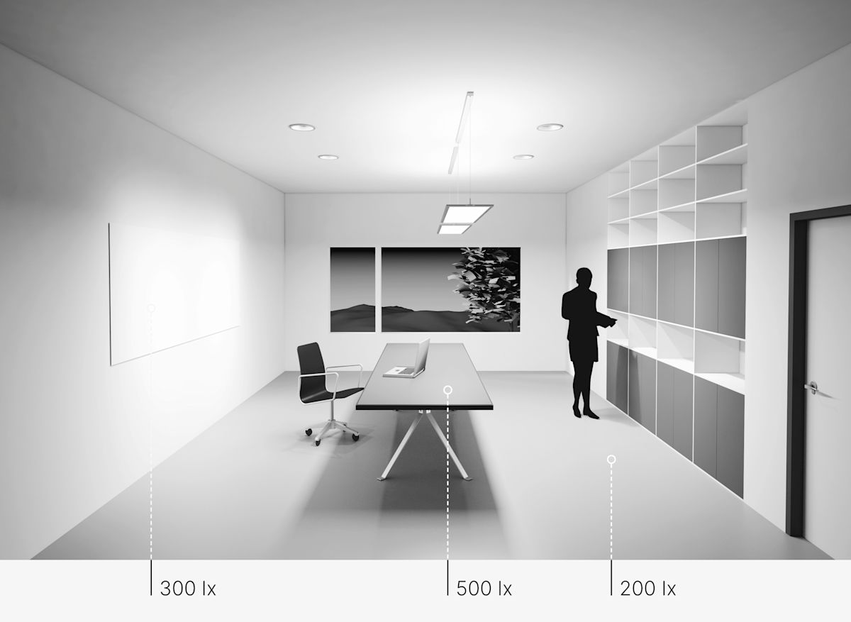 Des suspensions de grande taille produisent une lumière douce, sans éblouissement. La part principale de l’éclairage est diffusée vers le bas. Sur la table de travail, l’éclairement atteint 500 lx. Le reste de l’éclairage est extensif et orienté vers le haut. Des plafonniers encastrés réglables illuminent le tableau pense-bête et l’étagère. Aucune lumière de la pièce n’est éblouissante. Nous conseillons ici également d’utiliser un système de gestion d’éclairage.