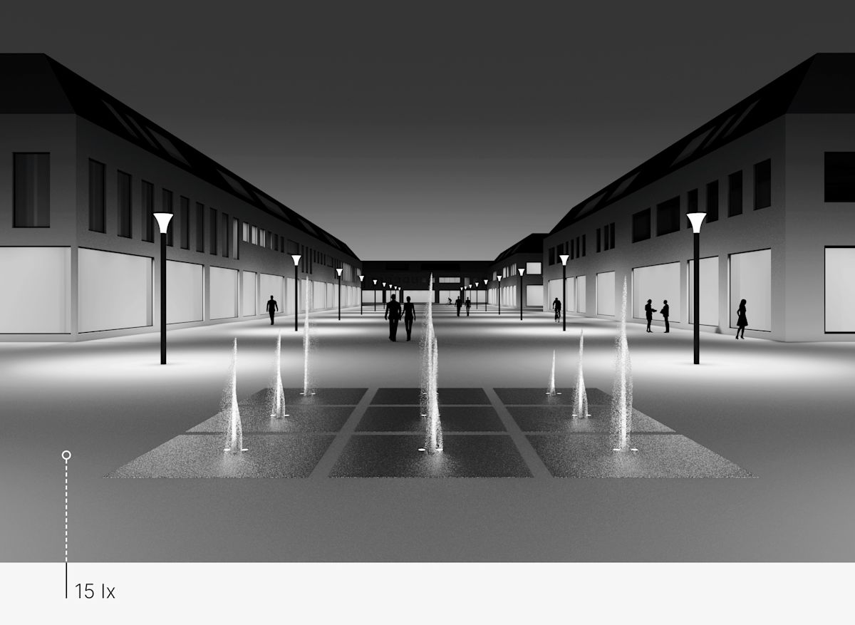 Un jeu d’eaux forme le point central d’une place urbaine. L’éclairage est réalisé à l’aide de luminaires encastrés dans le sol, qui mettent en scène de façon spectaculaire le jeu d’eaux. La place est entourée de commerces, de cafés et de restaurants et donc animée de jour comme de nuit. Dans l’obscurité, des profilés lumineux confèrent à la place un éclairage agréable tout en la structurant. Leur lumière douce permet de bien distinguer les personnes. L’espacement des profilés lumineux atteint 24 m.