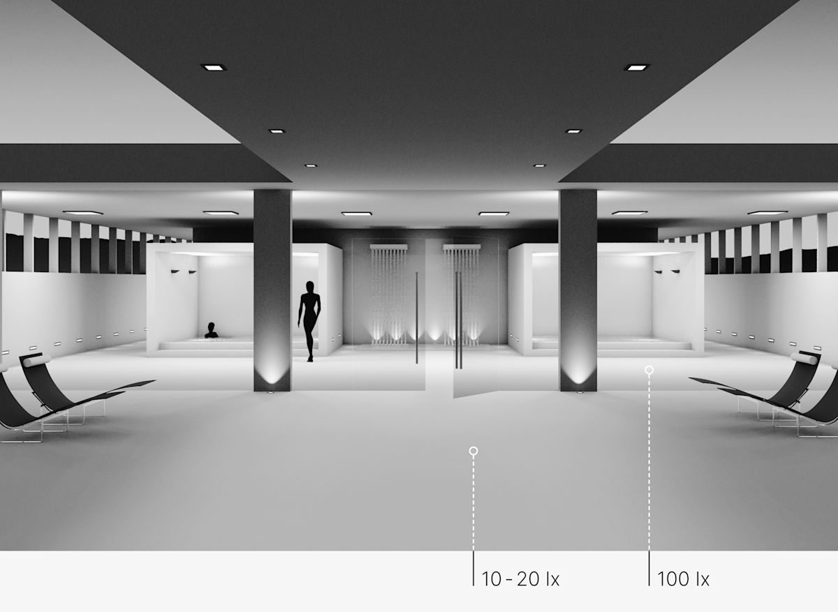 Dans un espace de Spa, l’éclairage contribue de façon déterminante au bien-être des clients. Une lumière tamisée alternant avec des zones dotées d’un éclairage d’appoint sont idéales pour la détente et le repos. Dans le même temps, l’installation d’éclairage doit être en mesure d’éclairer vivement les locaux à des fins de nettoyage. En raison des conditions climatiques qui règnent dans de telles installations, seuls sont utilisés des luminaires à indice de protection élevé. Dans les jacuzzis, des appliques projettent un éclairage extensif au plafond, doucement réfléchi dans la pièce. Les bassins sont équipés de luminaires immergés, dont la couleur de lumière RGBW est réglable. Entre les jacuzzis, des projecteurs encastrés dans le sol mettent la douche en valeur. Cet effet lumineux est reproduit sur les colonnes au premier plan par des projecteurs encastrés dans le sol. Depuis le plafond, une douce lumière se diffuse dans la pièce par des luminaires plats et carrés. Les appliques encastrées jalonnent les allées à 40 cm de hauteur, structurant l’espace pour plus de sécurité. Des spots ont été encastrés dans la couverture de terrasse extérieure.