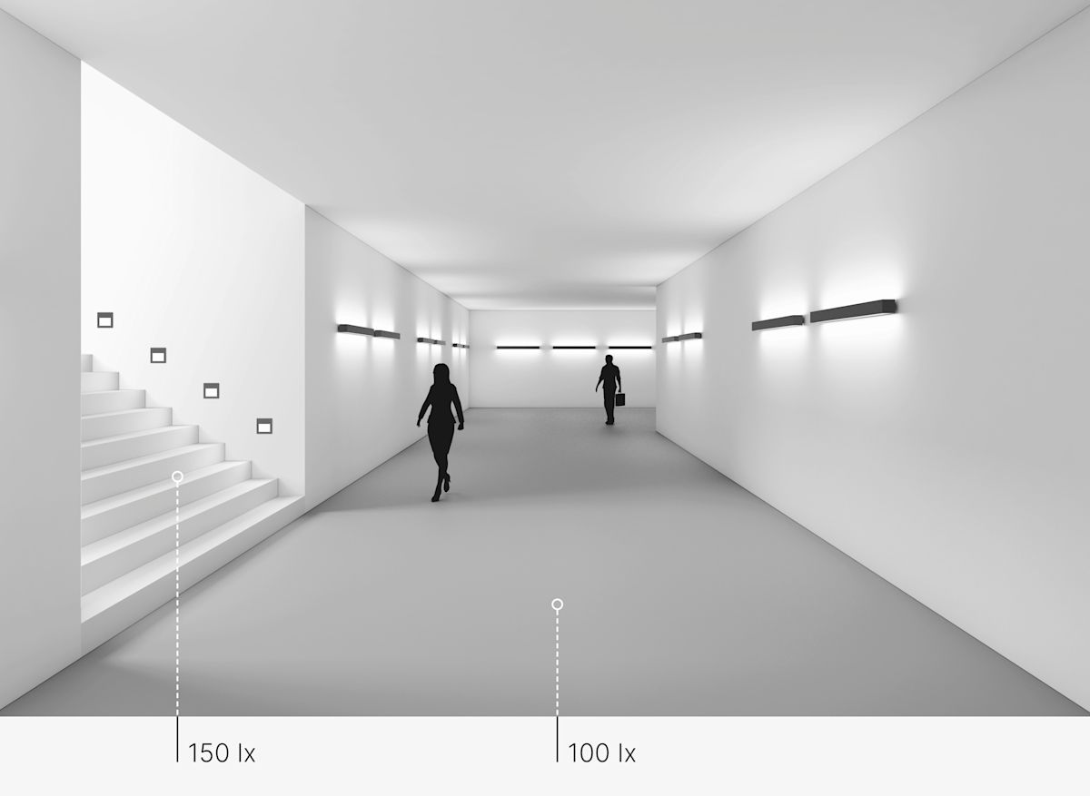 Un passage souterrain entre deux groupes de bâtiments doit correspondre au style architectural de l’édifice. Dans le cas présent, l’architecture est ouverte, claire, et communique avec la lumière du jour grâce à une grande surface vitrée. Cet effet lumineux doit également être atteint dans la liaison souterraine. Dans ce but, des appliques à diffusion lumineuse bidirectionnelle disposées graphiquement accompagnent les passants dans le passage souterrain. Une moyenne de 100 lx est atteinte au sol. Le flux lumineux garantit une excellente reconnaissance des visages. Le passage offre ainsi une ambiance conviviale et chaleureuse. Les marches de l’escalier sont encadrées d’appliques encastrées à répartition lumineuse asymétrique.