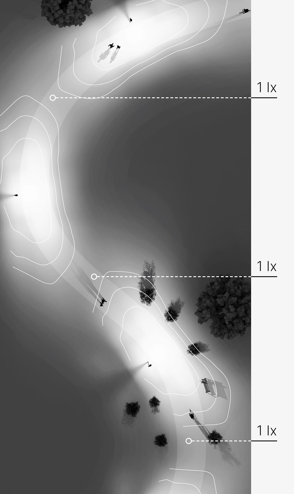L’immagine mostra la trasmissione della curva di distribuzione sulla rappresentazione del percorso pedonale/pista ciclabile dall’alto. Il punto più scuro sul percorso tra gli apparecchi ha un’intensità luminosa di 1 lx. La transizione dal punto più luminoso (15 lx) al punto più scuro è molto morbida e quindi percepita come piacevole.