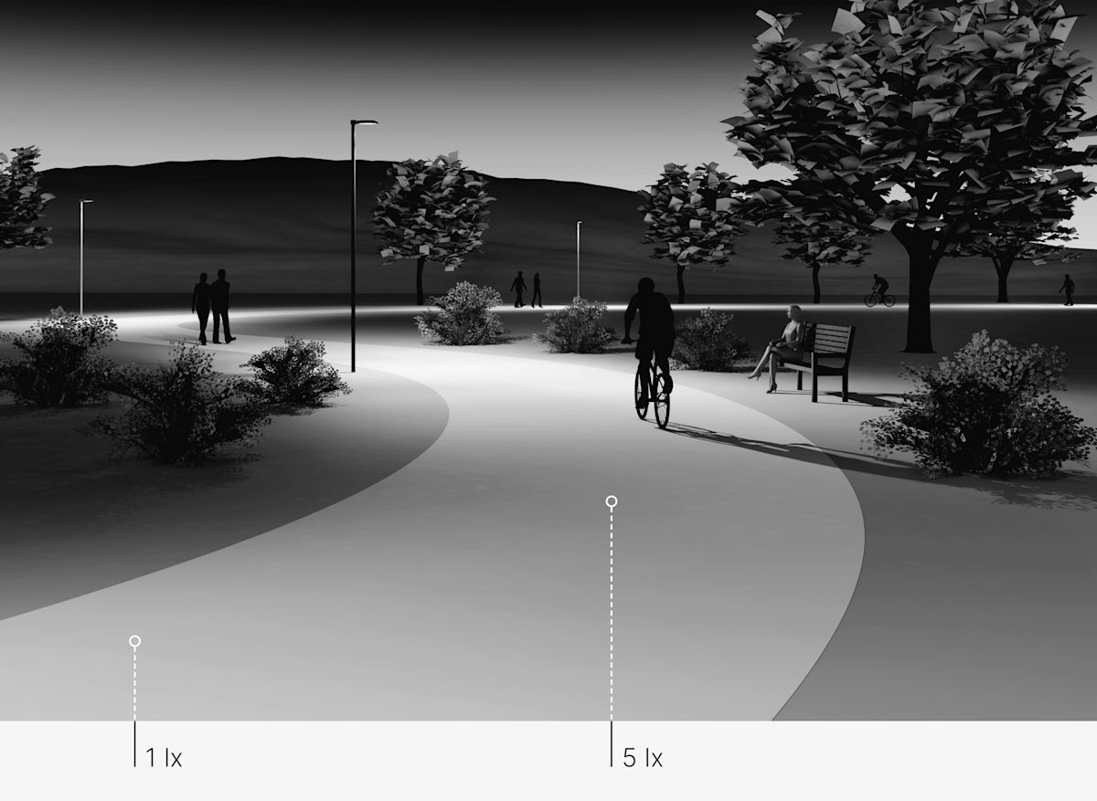 I pedoni e i ciclisti, come anche le stesse piste e strade, devono poter essere chiaramente riconoscibili, per trasmettere una sensazione di sicurezza. L’intensità luminosa per strade pedonali e piste ciclabili è disciplinata dalla norma DIN EN 13201-2, classe di illuminazione P4. È richiesto un minimo di 1 lx. Il grado medio di illuminamento è 5 lx.