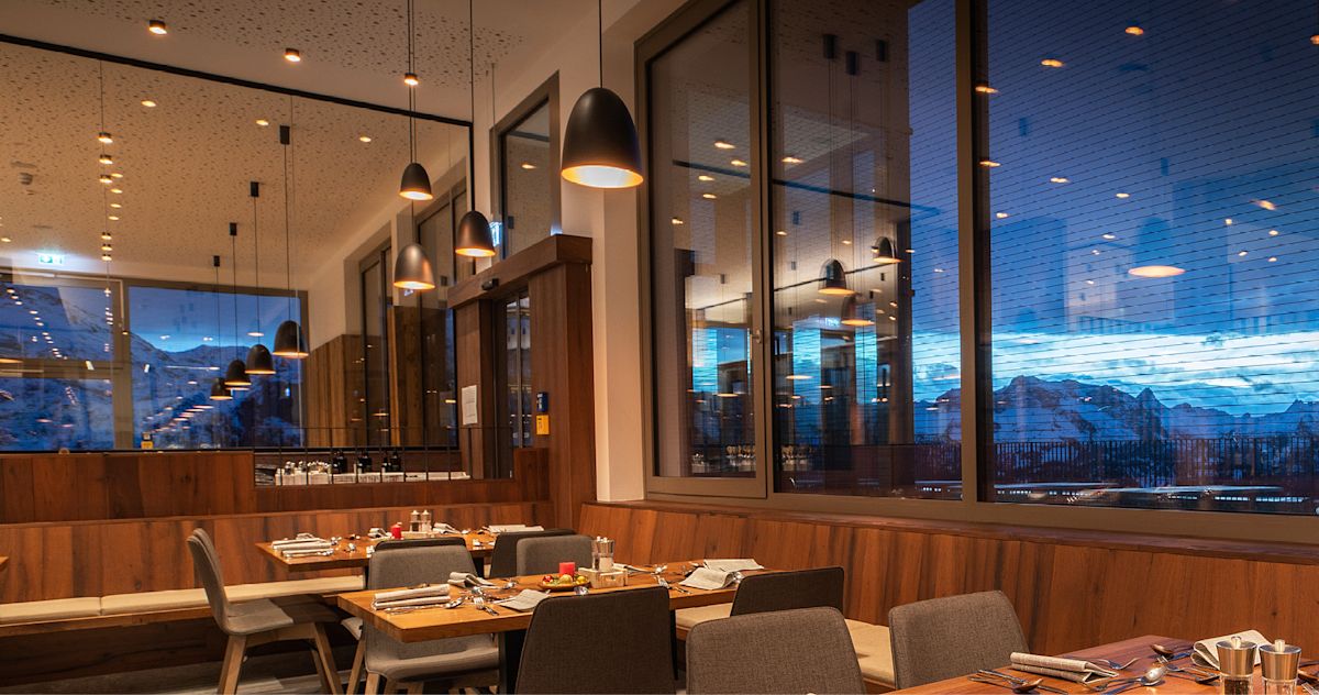The harmonious interplay of BEGA luminaire types – featuring a velvet black exterior and copper-toned interior – creates cohesive and atmospheric illumination throughout the restaurant. The two types of pendant luminaires work in perfect harmony, accentuating the space while offering structure and ambience, guiding guests through the room with subtle elegance. This thoughtful lighting design supports the Jenneralm’s diverse offerings – from serene sunrise breakfasts and hearty post-hike meals to elegant evening dinners framed by the breathtaking alpine panorama.