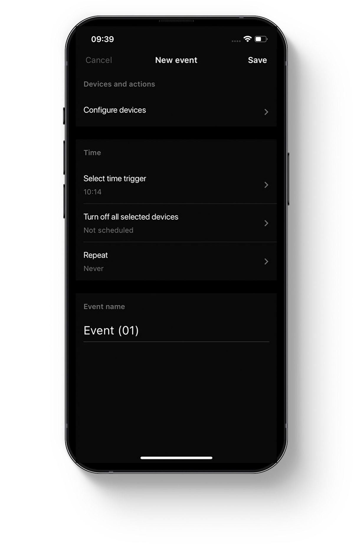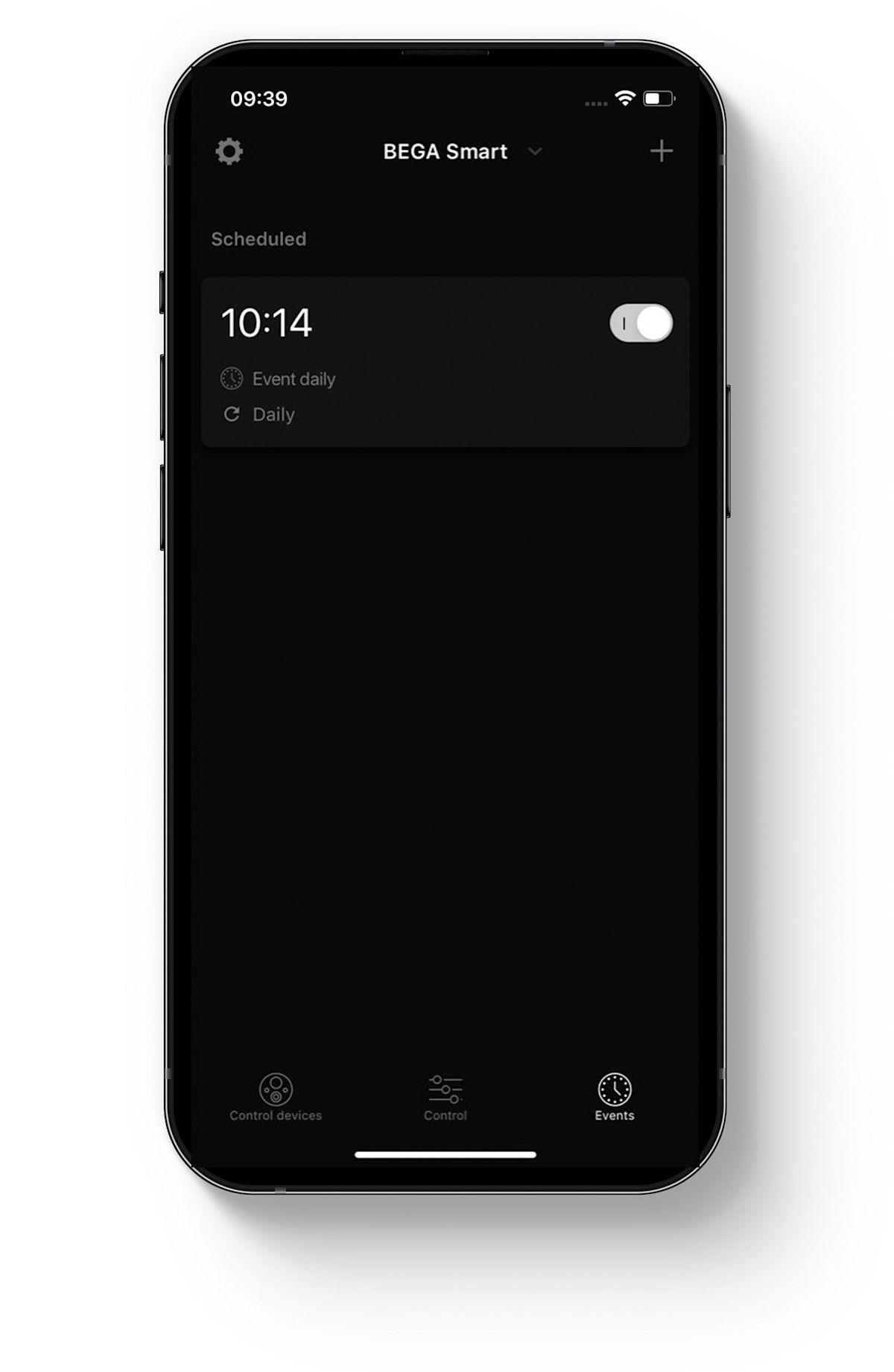 Gebruik de functie ‘Gebeurtenissen’ om de BEGA Smart verlichting geautomatiseerd in scène te zetten. Hiermee kunt u verlichtingssferen tijdsafhankelijk activeren of deactiveren. Gebeurtenissen kunnen puur op tijd zijn gebaseerd, bijv. het inschakelen van een lichtscène om 9:00 uur. Ook kunnen gebeurtenissen worden aangemaakt die afhankelijk van de zonsopgang/-ondergang plaatsvinden. Voorbeeld: Inschakelen van de verlichting bij zonsondergang. (Er kan een offset van +/- 120 min worden ingesteld).