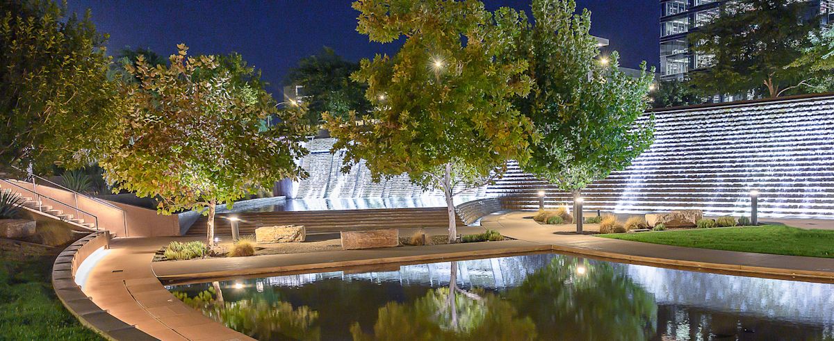 De voorkant van de stuwdam wordt door de lichten in de waterbronnen verlicht, die langs de stenen trappen van de gesimuleerde stuwdam schijnen. Deze lampen vangen de schoonheid van het kabbelende water en de geprogrammeerde overstromingen, die in de loop van de avond magische shows bieden. De achterwand bovenaan de waterpartij wordt vanaf de andere kant van het naburige pad verlicht door BEGA groot vermogen schijnwerpers, die zijn gecombineerd met afschermingen en roosters voor een gelijkmatige verlichting en minder strooilicht. De waterpartij en het omringende park bieden een unieke sfeer en een microklimaat waarvan de naburige kantoorhuurders en bewoners kunnen genieten en die ruimte biedt voor privé- en openbare evenementen.