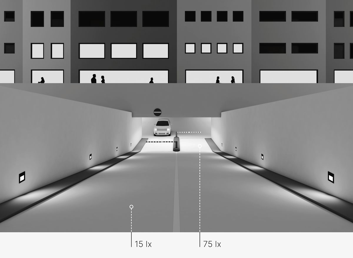 Ook hier is de veiligheid van de gebruikers van het grootste belang. De overgang naar de ondergrondse parkeergarage moet aangepast aan het uur van de dag verlicht worden, om extreme overgang tussen licht en donker te vermijden. Zo wordt dit gedeelte overdag met 300 lx en 's nachts met 75 lx verlicht. De helling naar de ondergrondse garage wordt verlicht met wandinbouwarmaturen. Hun asymmetrisch-bandvormige lichtsterkteverdeling zorgt voor een gelijkmatig verlichting van de rijbaan.