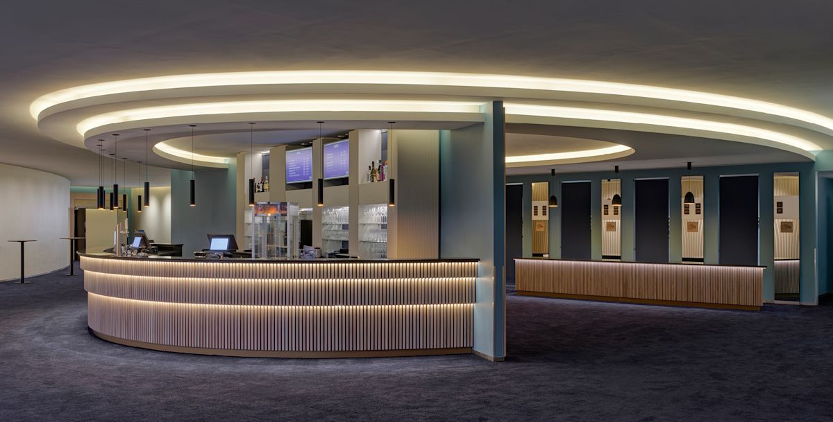 Het nieuwe ontwerp van de VIP-lounge van het theater combineert stijlvolle vormgeving met functionele verlichting. De gebogen bar is met z'n gestructureerde front is een echte blikvanger en vormt samen met de gestylede zitgroepen een harmonieus geheel. Grote afbeeldingen op de wand zorgen voor culturele accenten. Pendelarmaturen van de serie STUDIO LINE van BEGA zorgen voor een evenwichtig lichteffect: directe verlichting voor balies en tafels, indirect licht voor een zachte verlichting van plafonds. Het doordachte samenspel van materialen, kleuren en lichtdesign geeft de ruimte een luxe uitstraling en een hoog zichtcomfort.
