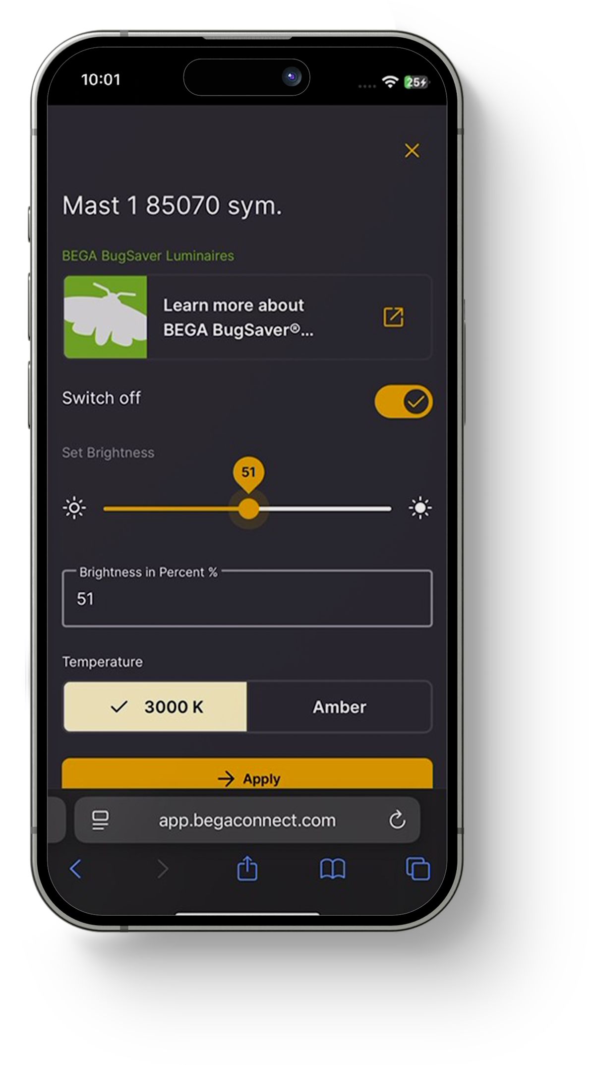 BEGA Connect är det perfekta verktyget för att genomföra en sådan effektiv styrning. Flexibiliteten hos BEGA BugSaver ®-tekniken kan också utnyttjas fullt ut. Hit hör exempelvis möjligheten att anpassa omkopplings- och reduceringsalternativ för mycket olika skyddskrav som gäller olika nattider och årstider.