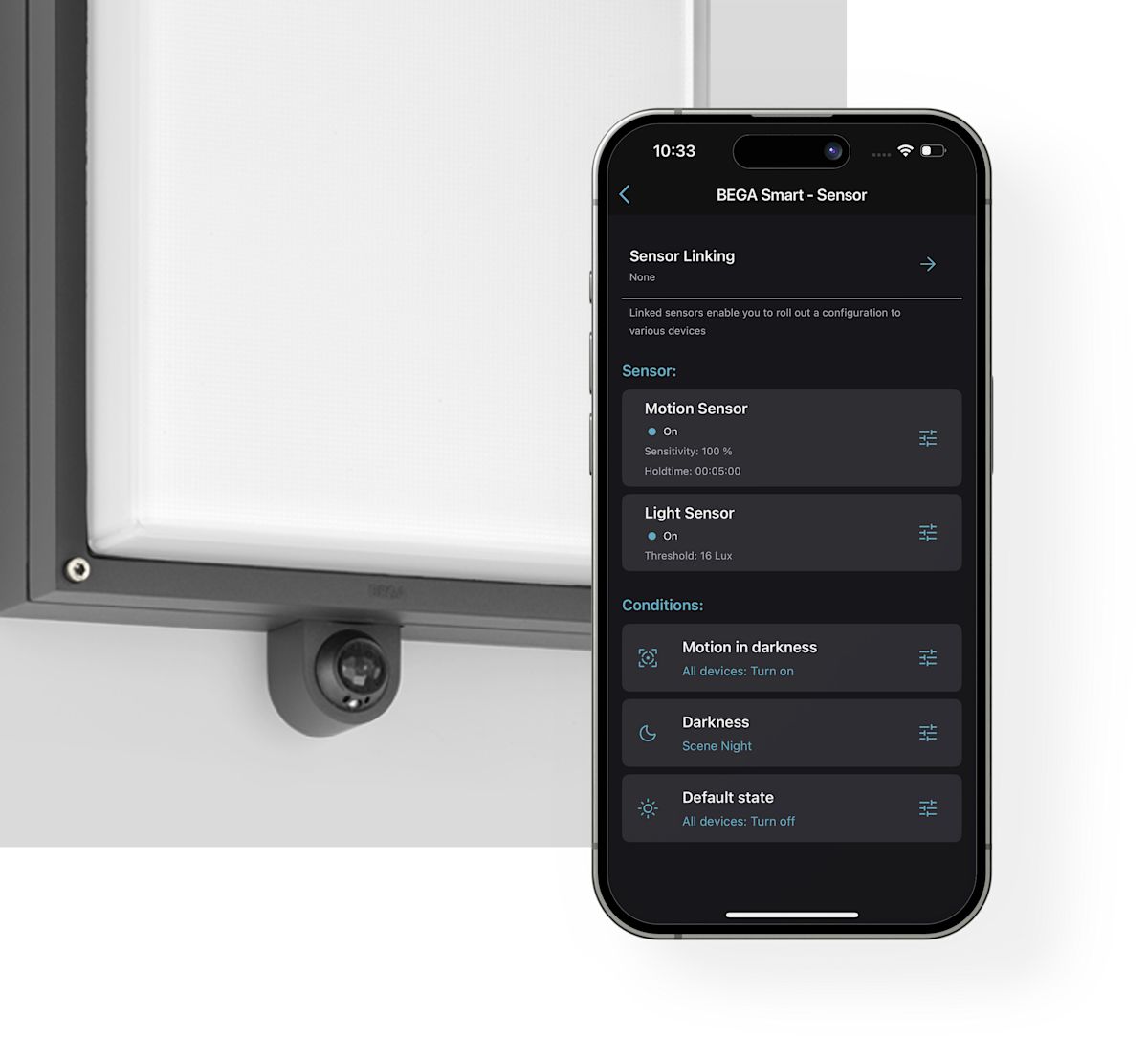 BEGA Smart är smart ljusstyrning för hem och trädgård. Armaturer med PIR-sensor tänds automatiskt vid skymning och rörelse samt styr fler anslutna armaturer. Alternativt finns det även smarta armaturer utan rörelsedetektor som kan styras via app, timer eller manuellt. På så sätt kan du utforma din belysningsmiljö flexibelt, energieffektivt och precis som du vill – enkelt och intuitivt med den kostnadsfria BEGA Smart-appen.